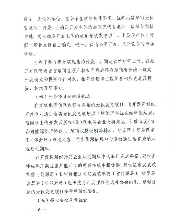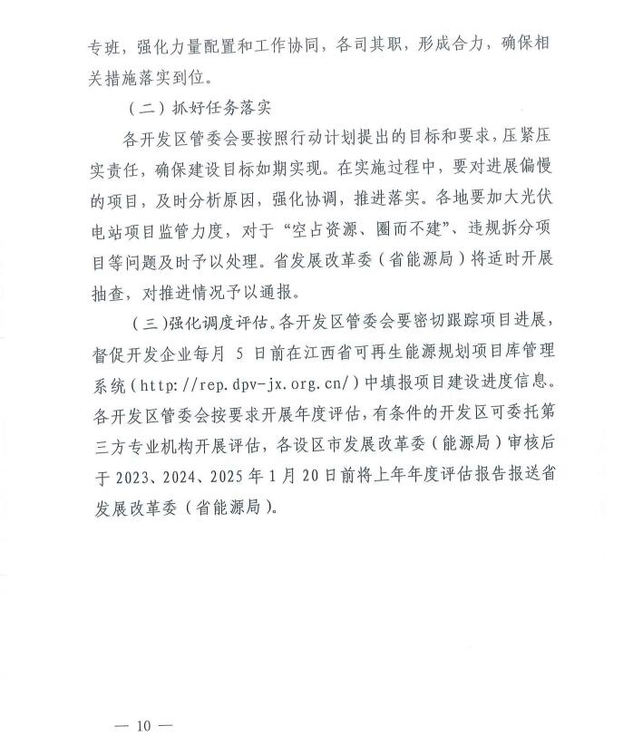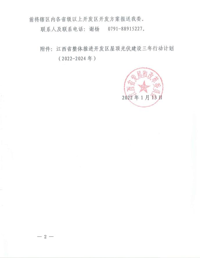 為深入貫徹碳達峰、碳中和重大戰(zhàn)略決策,加快發(fā)展可再生能源,實施可再生能源替代行動,提升我省開發(fā)區(qū)能源自供給能力,我委編制了《江西省整體推進開發(fā)區(qū)屋頂光伏建設(shè)三年行動計劃( 2022-2024年)》,經(jīng)委主任辦公會審議通過后印發(fā)給你們,請認(rèn)真貫徹執(zhí)行。各設(shè)區(qū)市發(fā)展改革委(能源局)于3月10日前將轄區(qū)內(nèi)各省級以上開發(fā)區(qū)開發(fā)方案報送我委。