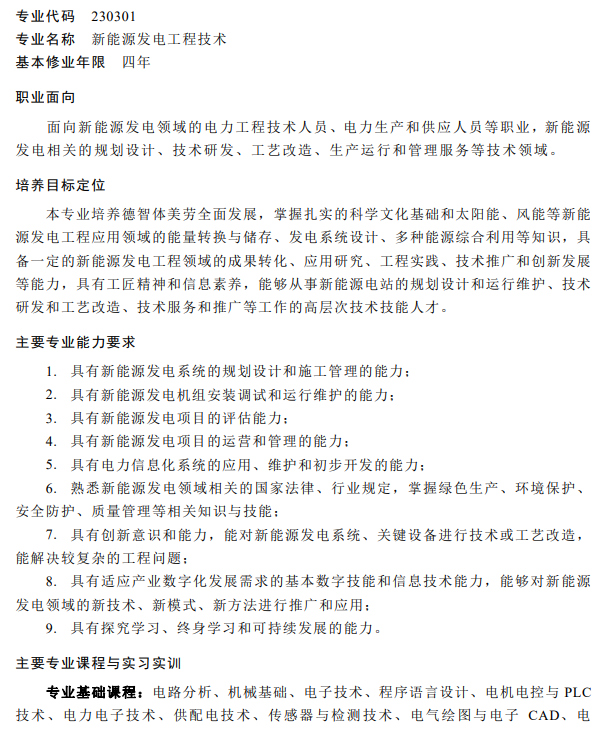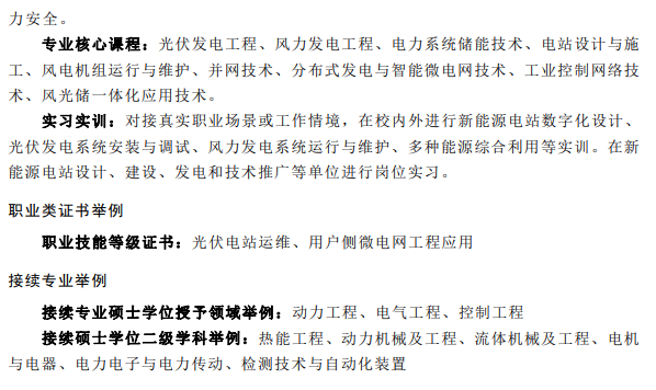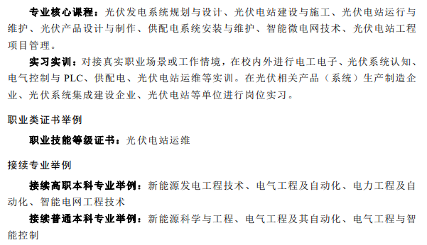在中等職業(yè)教育、高等職業(yè)教育專科專業(yè)、高等職業(yè)教育本科專業(yè)的簡介中均包含光伏相關(guān)專業(yè),都同屬于能源動力與材料大類新能源發(fā)電工程類。