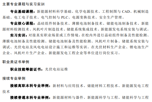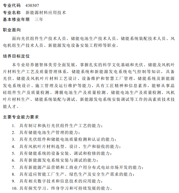 在中等職業(yè)教育中,包括光伏工程技術(shù)與應(yīng)用專業(yè)、太陽能與沼氣技術(shù)利用兩個專業(yè)。高等職業(yè)教育??茖I(yè)中,包括光伏工程技術(shù)、新能源材料應(yīng)用技術(shù)兩個專業(yè)。高等職業(yè)教育本科專業(yè)中僅有新能源材料應(yīng)用技術(shù)一個相關(guān)專業(yè)。