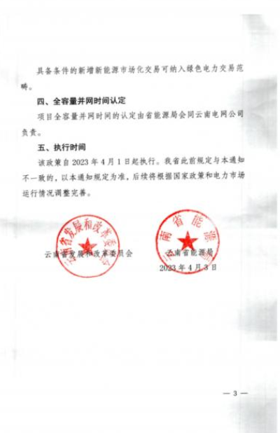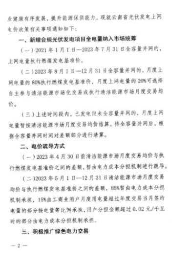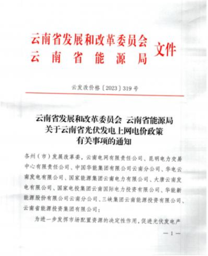 4月3日,云南省發(fā)展和改革委員會(huì)、云南省能源局發(fā)布了《關(guān)于云南省光伏發(fā)電上網(wǎng)電價(jià)政策有關(guān)事項(xiàng)的通知》。該政策自2023年4月1日起執(zhí)行。通知顯示,為進(jìn)一步發(fā)揮市場配置資源的決定性作用,促進(jìn)光伏發(fā)電產(chǎn)業(yè)健康有序發(fā)展,提升能源保供能力,云南省對新增合規(guī)光伏發(fā)電項(xiàng)目全電量納入市場統(tǒng)籌。
