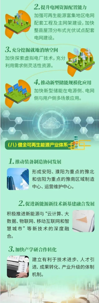 4月17日,河南發(fā)改委發(fā)布關(guān)于印發(fā)《河南省新能源和可再生能源發(fā)展“十四五”規(guī)劃》的通知。規(guī)劃明確了“十四五”期間全省發(fā)展目標(biāo),到2025年,全省再生能源消費(fèi)總量達(dá)到4700萬噸標(biāo)煤左右,占一次能源消費(fèi)總量比重16%左右;風(fēng)電光伏發(fā)電裝機(jī)、發(fā)電量比2020年“翻一番”;生物天然氣年產(chǎn)量“翻一番”;可再生能源發(fā)電量增量在全社會(huì)用電量增量中的占比超過50%;可再生能源電力總量消納責(zé)任權(quán)重達(dá)到32.2%以上,可再生能源電力非水電消納責(zé)任權(quán)重達(dá)到25.9%以上;地?zé)崮芄┡⑸镔|(zhì)供熱、生物質(zhì)燃料、太陽能熱利用等非電利用規(guī)模達(dá)到300萬噸標(biāo)準(zhǔn)煤以上。