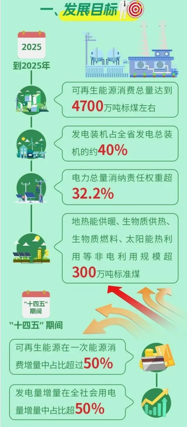 ——可再生能源發(fā)電目標(biāo)。2025年,可再生能源發(fā)電裝機(jī)達(dá)到5500萬千瓦以上,占全省發(fā)電總裝機(jī)的40%左右;可再生能源年發(fā)電量達(dá)到1000億千瓦時(shí)左右?!笆奈濉逼陂g,可再生能源發(fā)電量增量在全社會(huì)用電量增量中的占比超過50%。
