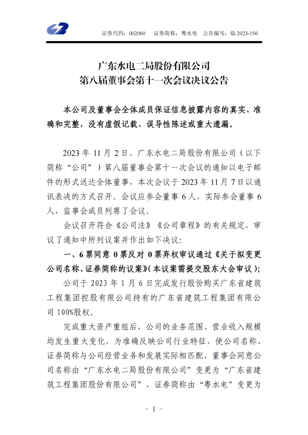 11月8日,粵水電發(fā)布公告稱,董事會同意將公司名稱由廣東水電二局股份有限公司變更為廣東省建筑工程集團股份有限公司。
