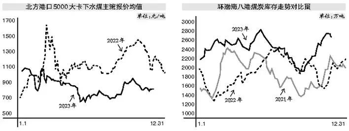 從10月中旬開始,市場煤價(jià)格進(jìn)入一個(gè)回落期,下跌趨勢(shì)一直延續(xù)到11月初。價(jià)格回落后,貿(mào)易商看漲情緒升溫,詢貨有所增多,加上第一次寒流來襲且水電進(jìn)入快速回落期,煤炭市場受到一定帶動(dòng),價(jià)格企穩(wěn)反彈。隨后在高庫存的壓制下,市場情緒又開始轉(zhuǎn)弱。進(jìn)入11月下旬,當(dāng)港口5000大卡下水煤價(jià)格再次回落至每噸800元左右時(shí),供應(yīng)方出貨意愿降低,疊加第二波寒潮降溫來臨,市場對(duì)電廠日耗回升有一定預(yù)期,價(jià)格小幅反彈。但這波寒潮影響時(shí)間較短,后續(xù)多地氣溫有所回升,且沿海地區(qū)受影響較小,電廠日耗環(huán)比增速略有放緩。電廠在高庫存的情況下,對(duì)高價(jià)接受程度有限,疊加港口高庫存疏港壓力加大,市場煤價(jià)格反彈支撐不足,短暫上漲后開始企穩(wěn)。