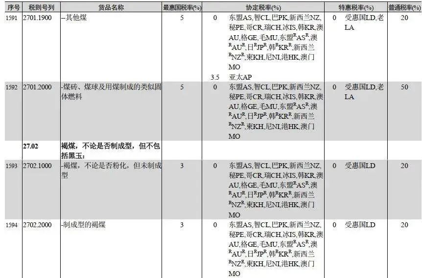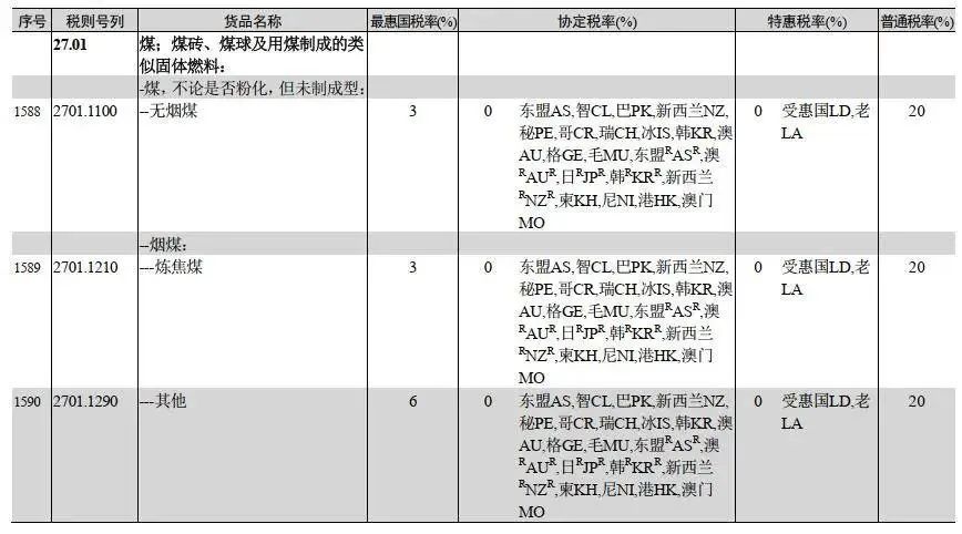 稅則顯示,2024年1月1日起,恢復(fù)煤炭進(jìn)口關(guān)稅。普通稅率為20%;特惠稅率為0;協(xié)定稅率基本為0;最惠國稅率中,無煙煤、煉焦煤、褐煤為3%,其他煤為6%。