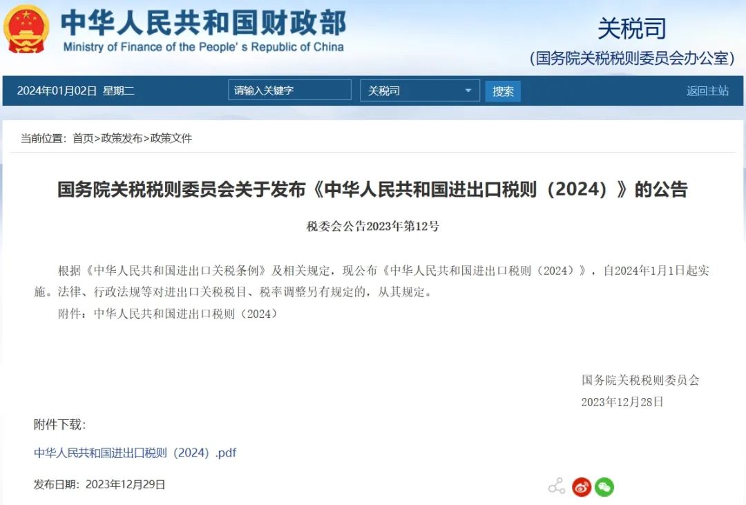 2023年12月29日,國務(wù)院關(guān)稅稅則委員會公布《中華人民共和國進(jìn)出口稅則(2024)》,自2024年1月1日起實施。相對于之前發(fā)布的公告,本次公布了進(jìn)出口產(chǎn)品具體的稅則,其中包含煤炭。