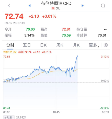 美東時間9月12日,國際油價暴漲,WTI原油日內(nèi)漲超3.5%,布倫特原油漲超3%。