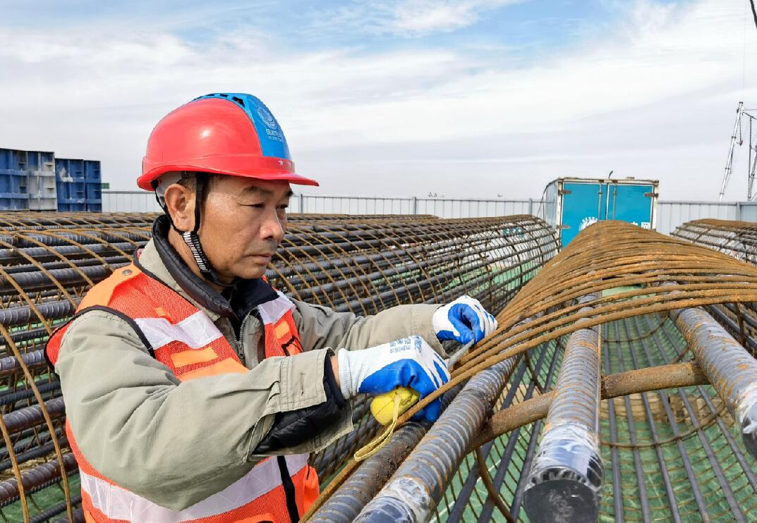 11月9日,在湖北省鐘祥市豐樂(lè)鎮(zhèn)楓梓院村 ,湖北送變電公司施工人員王玉清在白鶴灘至江蘇±800千伏特高壓直流輸電線路(鄂7標(biāo)段)漢江大跨越現(xiàn)場(chǎng),認(rèn)真檢查基礎(chǔ)鋼筋籠主筋長(zhǎng)度、直徑。該工程是國(guó)家“西電東送”戰(zhàn)略部署的重點(diǎn)工程,也是加大基礎(chǔ)設(shè)施領(lǐng)域補(bǔ)短板力度的工程之一。工程建成后,對(duì)優(yōu)化國(guó)家能源配置、保障電力安全穩(wěn)定供應(yīng)、推動(dòng)綠色發(fā)展等具有重要戰(zhàn)略意義。(張周、郭暉 攝)