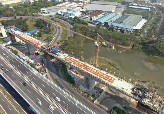 全長142.3公里的雅萬高鐵,正線80%以上設計為橋梁,其中大多數(shù)采用標準的預制箱梁連接。在跨越既有的公路、鐵路和河流等障礙的線路上,不少橋梁段采用了現(xiàn)澆工藝的連續(xù)梁施工。由水電八局承建的2號特大橋全長36公里,就有25處設計采用連續(xù)梁形式跨越立交橋、高速公路互通匝道及河流。這里的連續(xù)梁密度之高,施工難度之大,高鐵建筑史上罕見。因此,連續(xù)梁施工成為水電八局管段內(nèi)最重要的施工內(nèi)容之一。