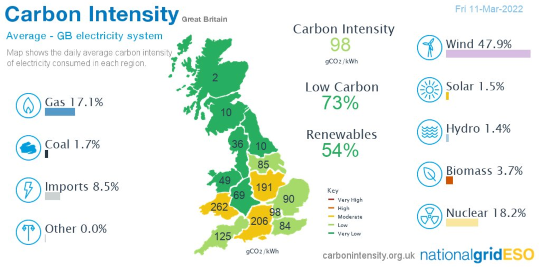據(jù)英國國家電網(wǎng)數(shù)據(jù),2022年3月11日(星期五)風(fēng)力發(fā)電占英國電力的47.9%,其次是核能18.2%,天然氣17.1%,進(jìn)口電力8.5%,生物質(zhì)3.7%,煤炭1.7%,太陽能1.5%,水力1.4%。