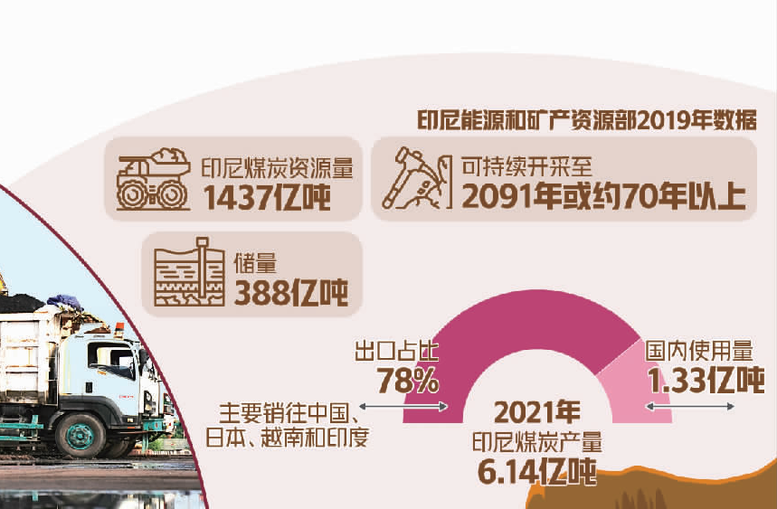 根據(jù)印尼能源和礦產(chǎn)資源部2019年數(shù)據(jù),印尼煤炭資源量為1437億噸,儲(chǔ)量為388億噸,可以持續(xù)開(kāi)采到2091年或大約70年以上。2021年,印尼煤炭產(chǎn)量達(dá)到6.14億噸,而國(guó)內(nèi)使用量?jī)H為1.33億噸,78%用于出口,是世界上動(dòng)力煤出口量最大的國(guó)家,主要銷(xiāo)往中國(guó)、日本、越南和印度。