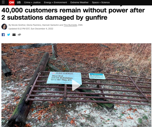 據(jù)美國有線電視新聞網(wǎng)(CNN)當(dāng)?shù)貢r(shí)間12月4日報(bào)道,因兩個(gè)變電站被槍擊破壞,美國北卡羅來納州摩爾縣(Moore County)正在經(jīng)歷大范圍停電,近4萬名用戶受到影響。