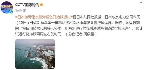 據(jù)日本共同社報(bào)道,日本東京電力公司今天(6月12日)開始對(duì)福島第一核電站核污染水排海設(shè)備進(jìn)行試運(yùn)行。據(jù)稱,試運(yùn)行期間“將使用淡水代替核污染水,用海水進(jìn)行稀釋后通過(guò)海底隧道排放入海”。預(yù)計(jì)試運(yùn)行將持續(xù)兩周左右的時(shí)間。