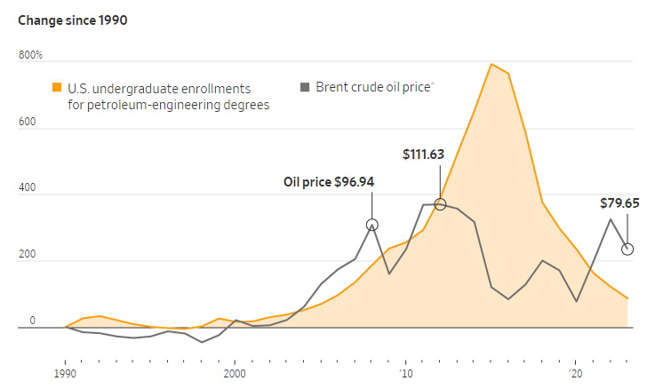 但根據(jù)美國教育部的數(shù)據(jù),在2016年至2021年期間,布倫特原油價(jià)格幾乎翻了一番,石油工程專業(yè)的畢業(yè)生人數(shù)卻減少了逾一半。