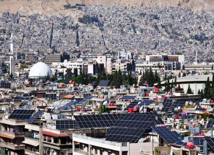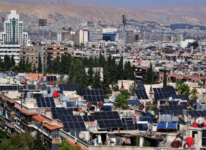 10月25日,在敘利亞首都大馬士革,一些房屋的頂上架設(shè)著太陽(yáng)能光伏發(fā)電板。