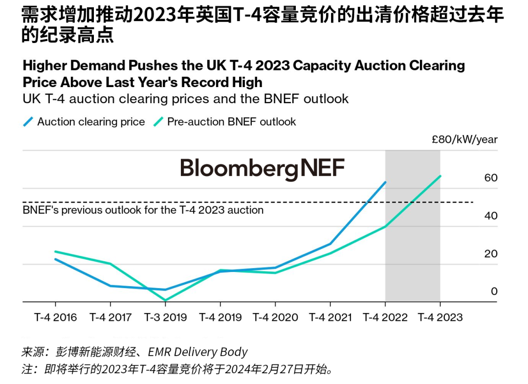 在即將舉行的2023年英國T-4容量競價中,對電力需求的向上修正導致供需比收緊,從而推高出清價格至66.25英鎊/kW,較我們之前的預測高出26%,并創(chuàng)下競價歷史新高。電池從這一變化中獲益最大,預計將有1GW新的非額定容量在競價中出清。出清價格上漲也將增加聯(lián)合循環(huán)燃氣輪機(CCGT)在競價中出清的可能性。