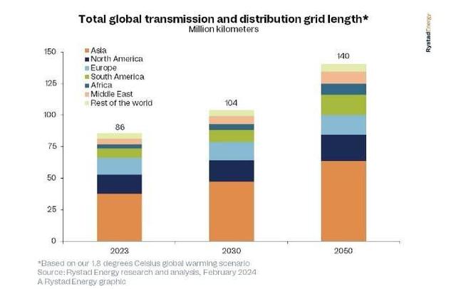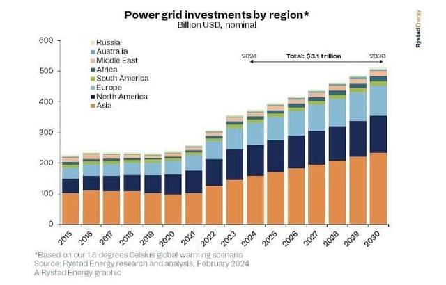 可再生能源的發(fā)展仍在以驚人的速度進(jìn)行,2024年將有6440億美元用于新增產(chǎn)能,但過(guò)時(shí)和不足的電網(wǎng)可能會(huì)成為能源轉(zhuǎn)型的重大障礙。根據(jù)Rystad Energy的研究,如果世界要將全球變暖限制在比工業(yè)化前水平高1.8攝氏度的范圍內(nèi),那么在2030年之前需要3.1萬(wàn)億美元的電網(wǎng)基礎(chǔ)設(shè)施投資。
