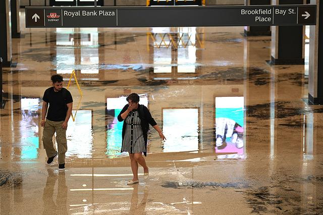 7月16日,加拿大多倫多的大部分火車(chē)因洪水延誤,乘客們走過(guò)車(chē)站。