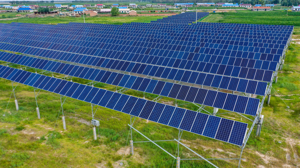 吉林省白城市鎮(zhèn)賚縣鎮(zhèn)賚鎮(zhèn)架其村的光伏設備(無人機照片)。新華社記者張楠 攝