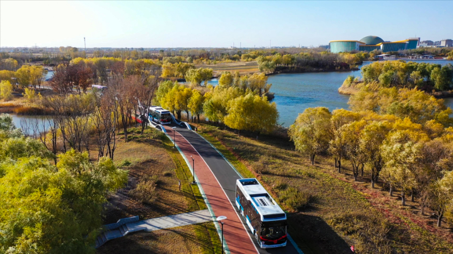 在吉林省白城市生態(tài)新區(qū)鶴鳴湖公園行駛的氫能公交車(2020年10月21日攝)。(受訪對象供圖)