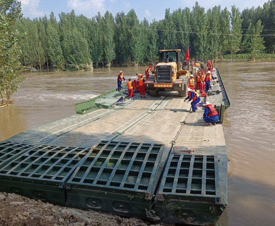 為了解決這個問題,安能三局用昨日在新鄉(xiāng)轉(zhuǎn)移被困群眾的應(yīng)急動力舟橋,運(yùn)輸挖掘機(jī)、推土機(jī)等大型裝備以及鋼筋籠和沙袋至決口右岸,今天又再一次立下大功。