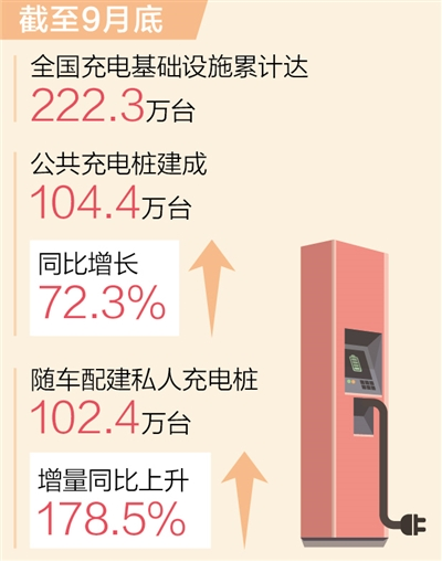 中國電動汽車充電基礎(chǔ)設(shè)施促進聯(lián)盟最新數(shù)據(jù)顯示,截至9月,全國充電基礎(chǔ)設(shè)施累計達(dá)222.3萬臺,同比增長56.8%。我國已建成全球最大規(guī)模充電設(shè)施網(wǎng)絡(luò)。