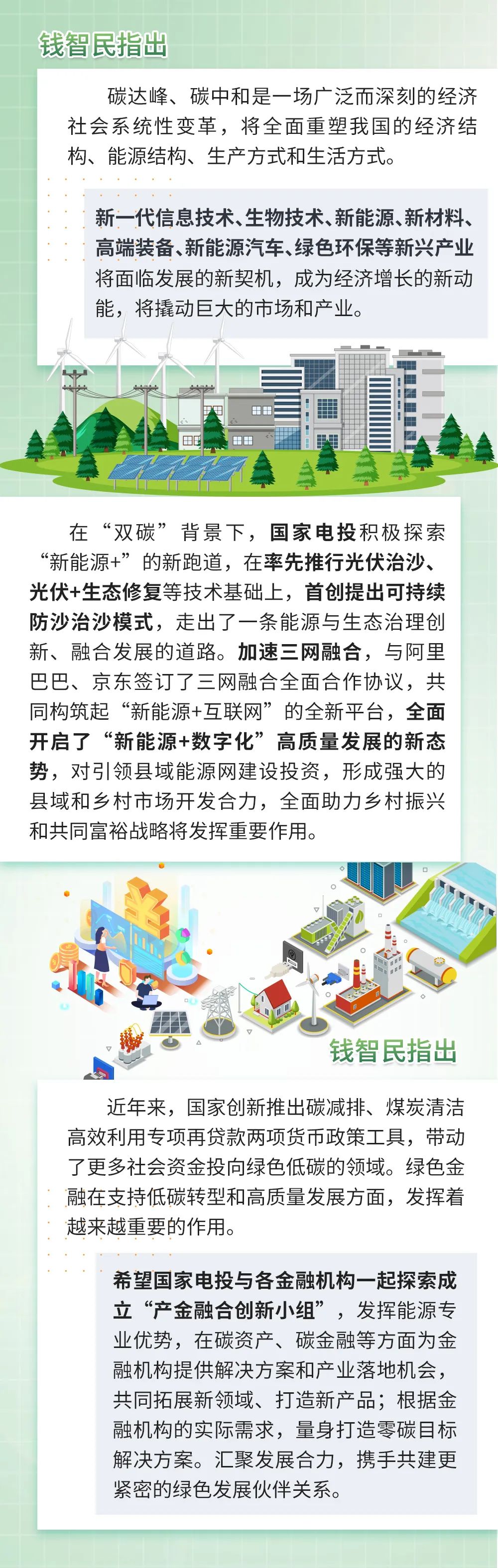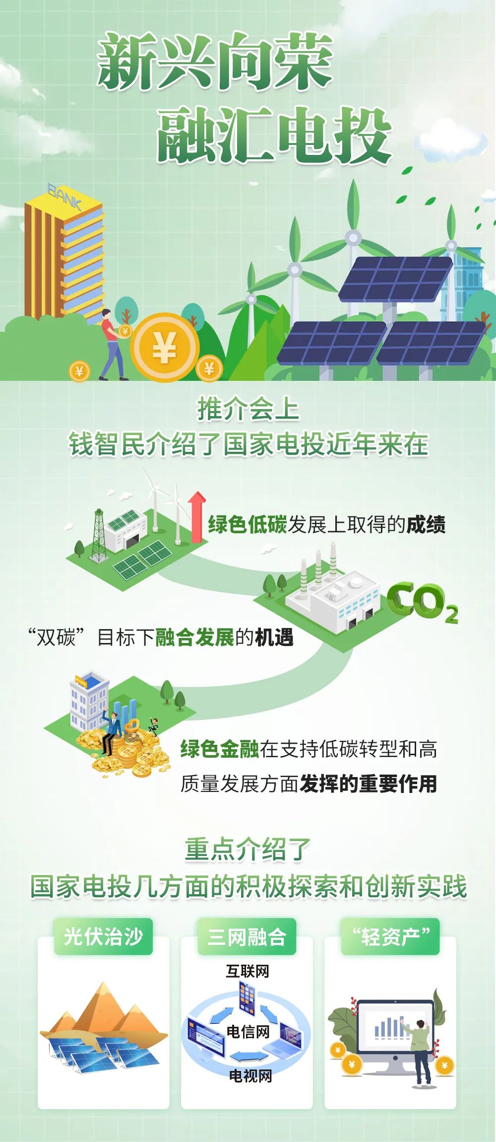 “錢智民介紹道,國家電投作為我國唯一擁有核電、火電、水電、風(fēng)電、光伏發(fā)電、生物質(zhì)發(fā)電等全部發(fā)電類型的能源企業(yè),深入踐行習(xí)近平總書記關(guān)于清潔低碳發(fā)展的重要指示批示精神,以“創(chuàng)造綠色價值”為使命,以“綠色 創(chuàng)新 融合,真信 真干 真成”為核心價值觀,制定了面向新時代的“2035一流戰(zhàn)略”,在綠色低碳發(fā)展上取得了顯著成效。目前,國家電投裝機總規(guī)模已突破2億千瓦,新能源發(fā)電裝機量、可再生能源發(fā)電裝機量、清潔能源發(fā)電裝機量均居世界第一。他表示,在全球能源結(jié)構(gòu)向非化石能源轉(zhuǎn)型的進(jìn)程中,把握“風(fēng)光無限”的未來機遇取決于新能源技術(shù)創(chuàng)新,更取決于金融。我們愿與金融企業(yè)共同發(fā)力,為實現(xiàn)中國能源清潔低碳轉(zhuǎn)型貢獻(xiàn)更大力量。”
