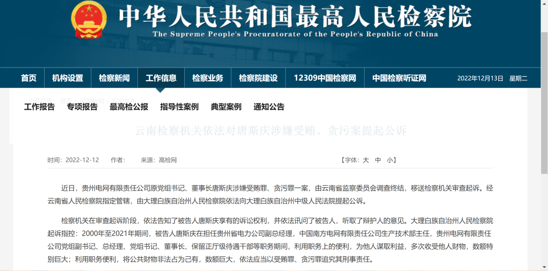 近日,貴州電網(wǎng)有限責任公司原黨組書記、董事長唐斯慶涉嫌受賄罪、貪污罪一案,由云南省監(jiān)察委員會調(diào)查終結(jié),移送檢察機關(guān)審查起訴。經(jīng)云南省人民檢察院指定管轄,由大理白族自治州人民檢察院依法向大理白族自治州中級人民法院提起公訴。