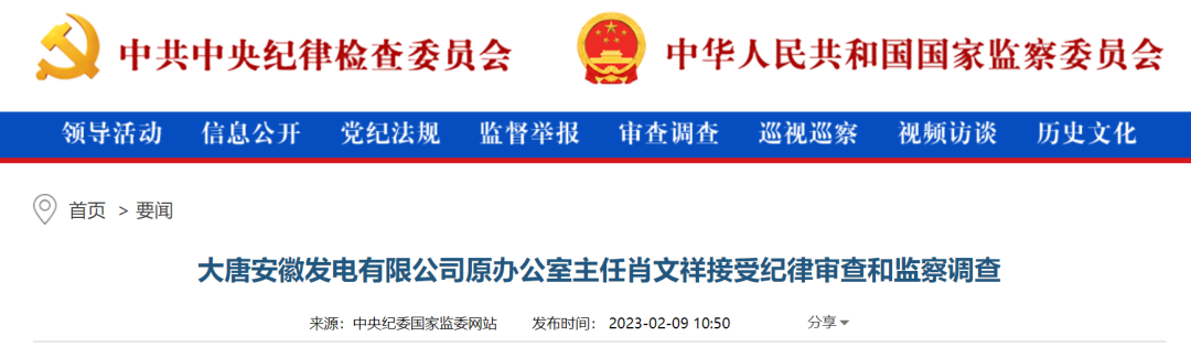 中央紀(jì)委國家監(jiān)委網(wǎng)站訊2月9日消息,據(jù)中國大唐集團(tuán)有限公司紀(jì)檢監(jiān)察組、安徽省監(jiān)察委員會(huì)消息:大唐安徽發(fā)電有限公司原辦公室主任肖文祥涉嫌嚴(yán)重違紀(jì)違法,目前正接受中國大唐集團(tuán)有限公司紀(jì)檢監(jiān)察組紀(jì)律審查和安徽省淮北市監(jiān)察委員會(huì)監(jiān)察調(diào)查。