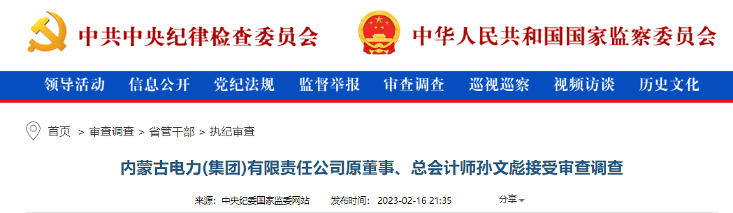 中央紀委國家監(jiān)委網(wǎng)站2月16日消息,據(jù)內蒙古自治區(qū)紀委監(jiān)委消息:內蒙古電力(集團)有限責任公司原董事、總會計師孫文彪涉嫌嚴重違紀違法,目前正接受內蒙古自治區(qū)紀委監(jiān)委紀律審查和監(jiān)察調查。