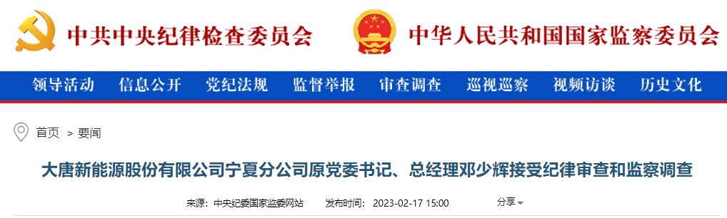 中央紀(jì)委國家監(jiān)委網(wǎng)站2月17日消息,據(jù)中國大唐集團(tuán)有限公司紀(jì)檢監(jiān)察組、寧夏回族自治區(qū)監(jiān)察委員會(huì)消息:大唐新能源股份有限公司寧夏分公司原黨委書記、總經(jīng)理鄧少輝涉嫌嚴(yán)重違紀(jì)違法,目前正接受中國大唐集團(tuán)有限公司紀(jì)檢監(jiān)察組紀(jì)律審查和寧夏回族自治區(qū)銀川市監(jiān)察委員會(huì)監(jiān)察調(diào)查。