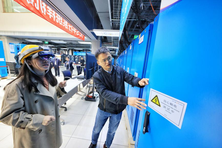“各位在電視屏幕里看到的,就是在機(jī)柜門(mén)沒(méi)開(kāi)的情況下,我們工作人員通過(guò)智能頭盔眼鏡看到的機(jī)柜內(nèi)畫(huà)面。”