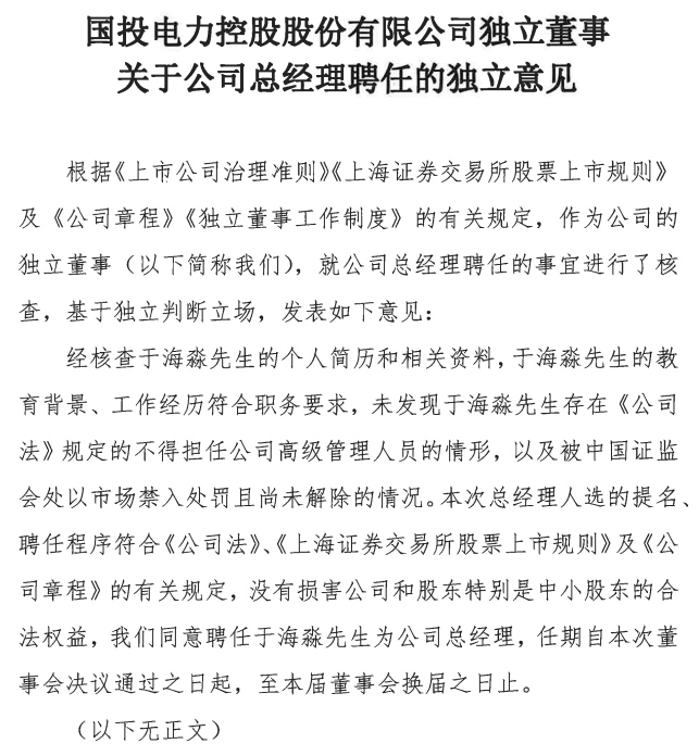 4月22日,國(guó)投電力發(fā)布《國(guó)投電力控股股份有限公司獨(dú)立董事關(guān)于公司總經(jīng)理聘任的獨(dú)立意見》。