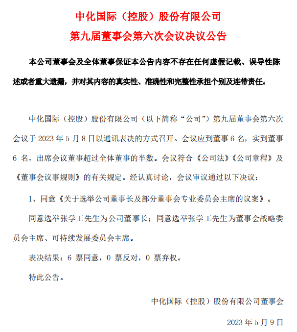 同日,中化國際發(fā)布公告,同意選舉張學(xué)工為公司董事長;同意選舉張學(xué)工為董事會戰(zhàn)略委員會主席、可持續(xù)發(fā)展委員會主席。