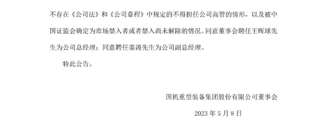 5月6日,國機重裝董事會審議通過了《關于聘任公司總經理、副總經理的議案》,同意聘任王暉球為公司總經理;同意聘任姜濤為公司副總經理。