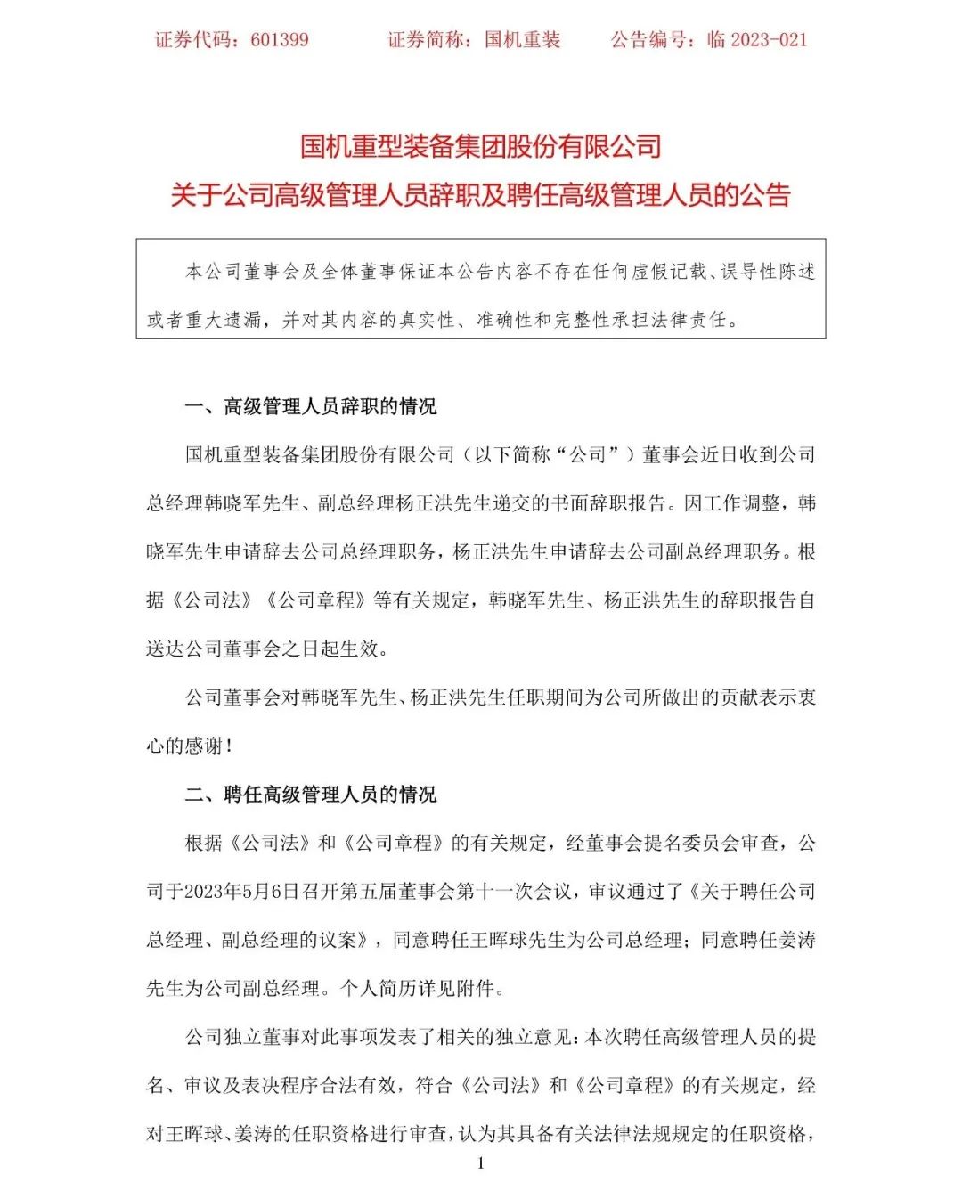 5月8日,國機重裝發(fā)布公告,董事會近日收到公司總經理韓曉軍、副總經理楊正洪遞交的書面辭職報告。因工作調整,韓曉軍申請辭去公司總經理職務,楊正洪申請辭去公司副總經理職務。