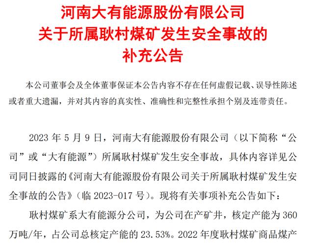 公告顯示,耿村煤礦系大有能源分公司,為公司在產(chǎn)礦井,核定產(chǎn)能為 360 萬噸/年,占公司總核定產(chǎn)能的 23.53%。2022 年度耿村煤礦商品煤產(chǎn) 量 287.45 萬噸,營業(yè)收入 13.22 億元,分別占公司同期商品煤產(chǎn)量 的 24.83%和營業(yè)收入的 15.39%。2023 年第一季度耿村煤礦商品煤產(chǎn) 量 51.51 萬噸,營業(yè)收入 2.15 億元,分別占公司同期商品煤產(chǎn)量的 18.32%和營業(yè)收入的 10.73%。目前,耿村煤礦正在組織實(shí)施停產(chǎn)救援,對公司造成的影響暫無法預(yù)測。公司將持續(xù)關(guān)注事故后續(xù)進(jìn)展并及時履行信息披露義務(wù),敬請廣大投資者注意投資風(fēng)險(xiǎn)。