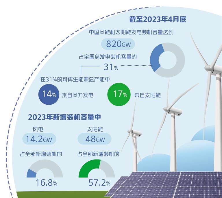 數(shù)據(jù)顯示,截至2023年4月底,中國風(fēng)能和太陽能發(fā)電裝機(jī)容量達(dá)到820吉瓦(GW),占全國總發(fā)電裝機(jī)容量的31%。在31%的可再生能源總產(chǎn)能中,14%來自風(fēng)力發(fā)電,17%來自太陽能。2023年新增裝機(jī)容量中,風(fēng)電14.2GW,太陽能48GW,分別占全部新增裝機(jī)的16.8%和57.2%。這意味著可再生能源裝機(jī)容量同比增長11.5%。