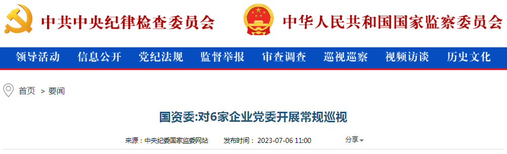 中央紀(jì)委國(guó)家監(jiān)委網(wǎng)站7月6日消息,經(jīng)國(guó)資委黨委批準(zhǔn),2023年第一輪巡視對(duì)中國(guó)化學(xué)工程集團(tuán)有限公司、中國(guó)鐵路工程集團(tuán)有限公司、中國(guó)鐵道建筑集團(tuán)有限公司、中國(guó)交通建設(shè)集團(tuán)有限公司、中國(guó)電力建設(shè)集團(tuán)有限公司、中國(guó)能源建設(shè)集團(tuán)有限公司等6家企業(yè)黨委開(kāi)展常規(guī)巡視。