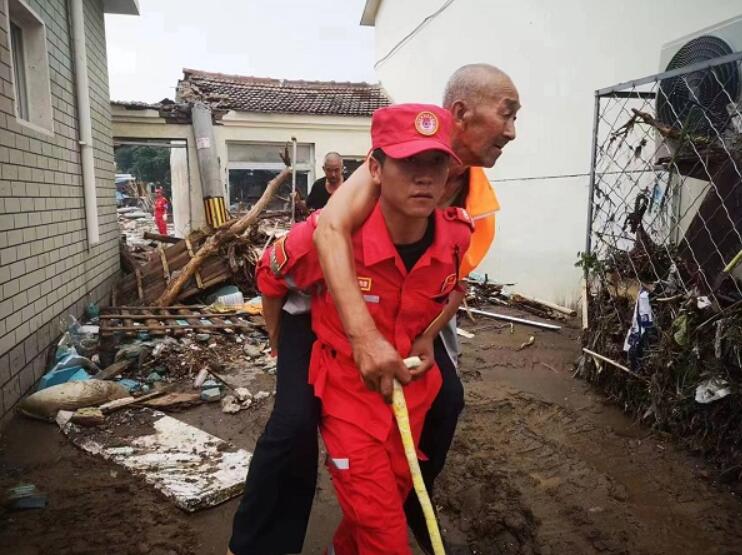 8月4日,北京門頭溝救援中,搶險隊員毛平背起行動不便老人奪門而出。
