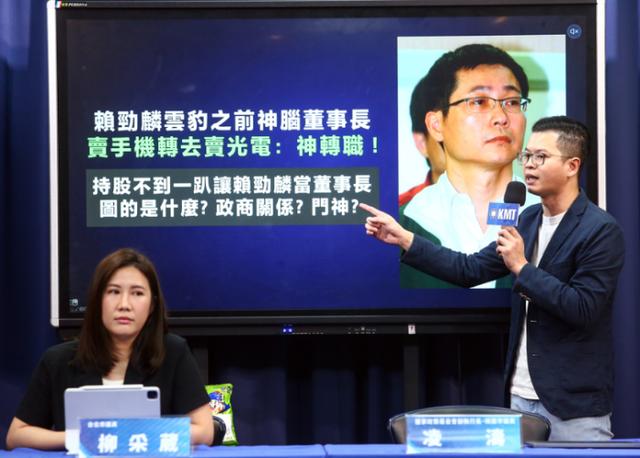 國民黨政策基金會副執(zhí)行長、桃園市議員凌濤在記者會上爆出云豹集團捐贈政治獻金給民進黨及“新潮流”政治人物。圖片來源:臺灣“中時新聞網(wǎng)”