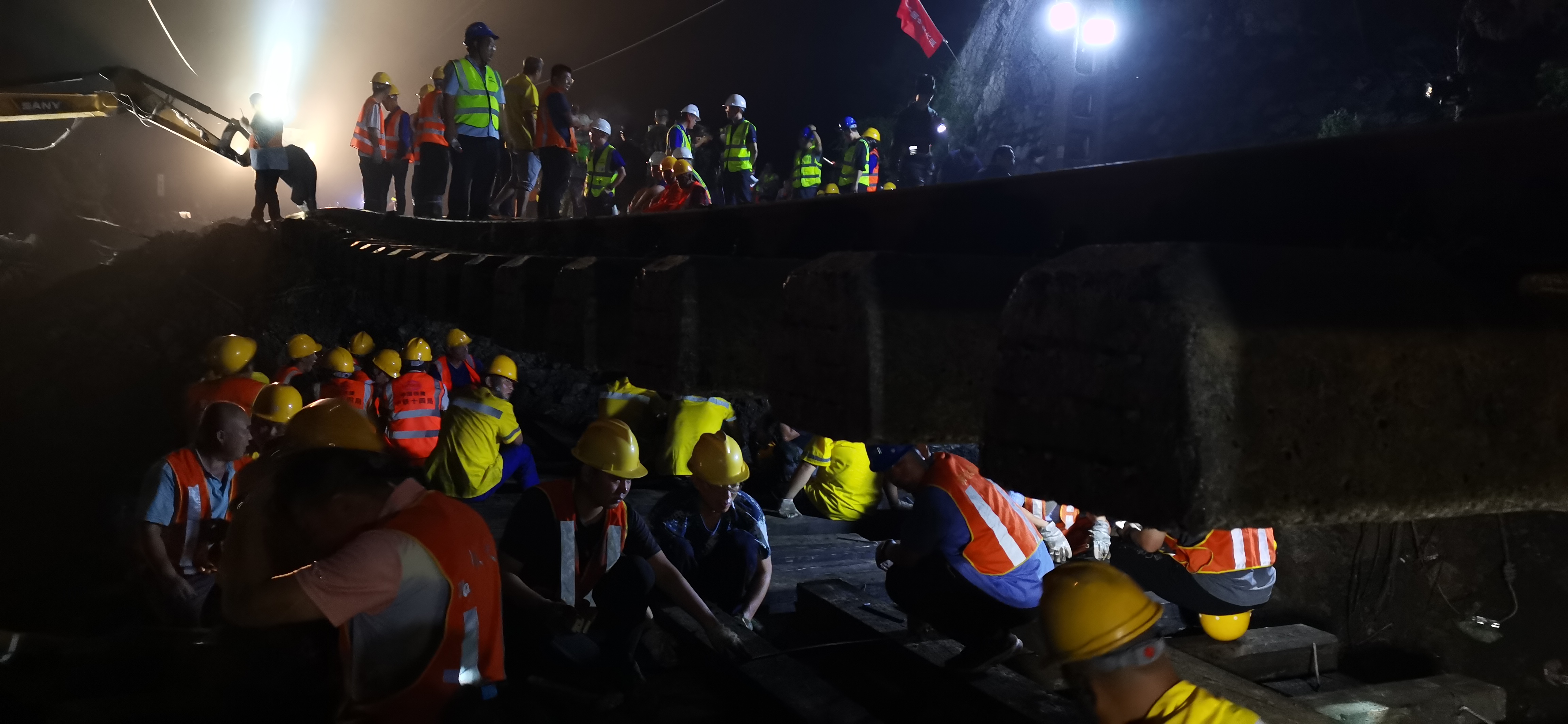 中鐵十四局調(diào)集300余名職工組成7支救援隊(duì),連夜翻山越嶺抵達(dá)搶險(xiǎn)一線,8月3日凌晨,在峽谷塌方前,組成“人墻”護(hù)欄,幫助Z180次列車503名乘客疏散到安全地帶。