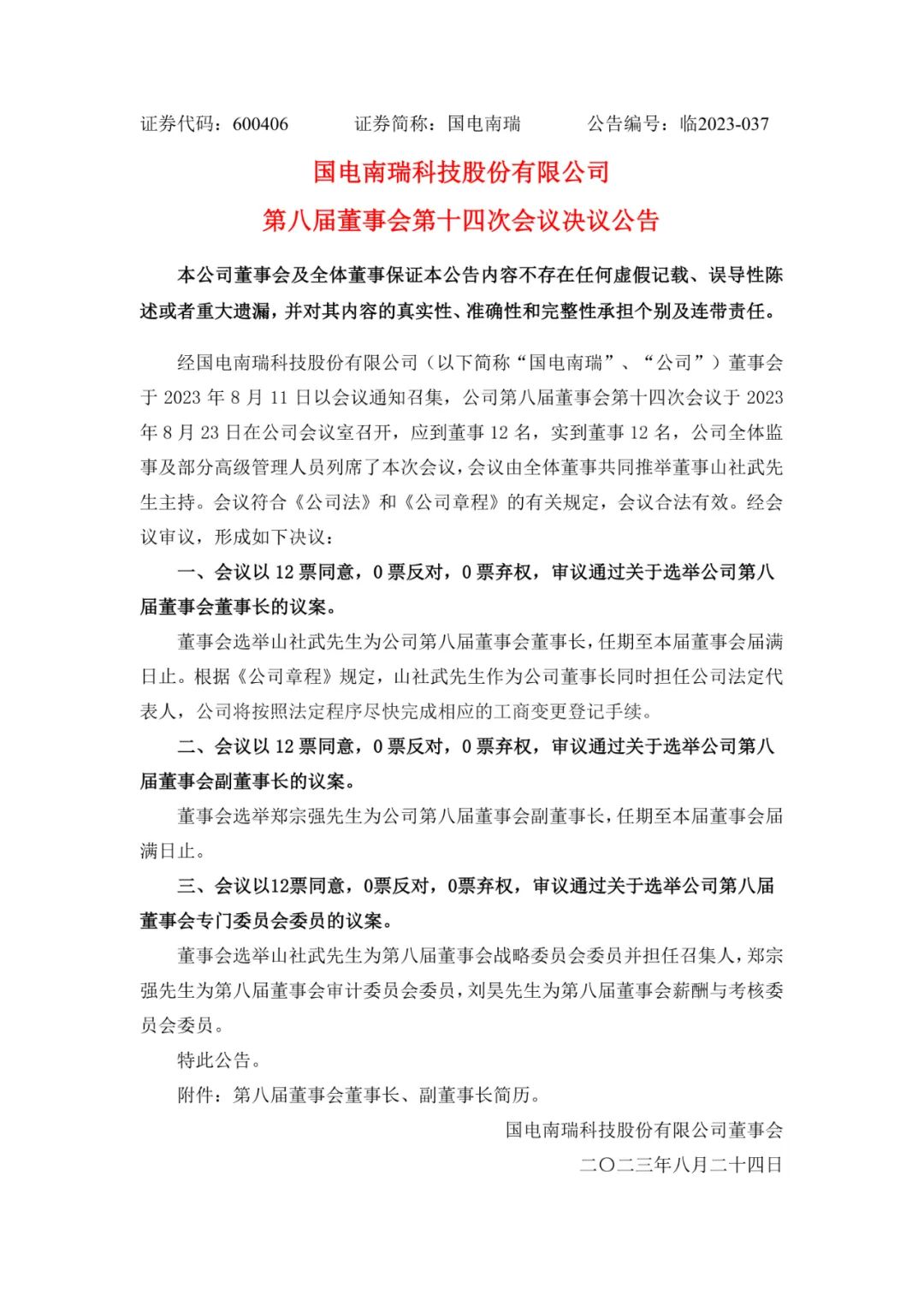 山社武任國(guó)電南瑞科技股份有限公司(以下簡(jiǎn)稱“國(guó)電南瑞”)董事長(zhǎng),鄭宗強(qiáng)任國(guó)電南瑞副董事長(zhǎng)。