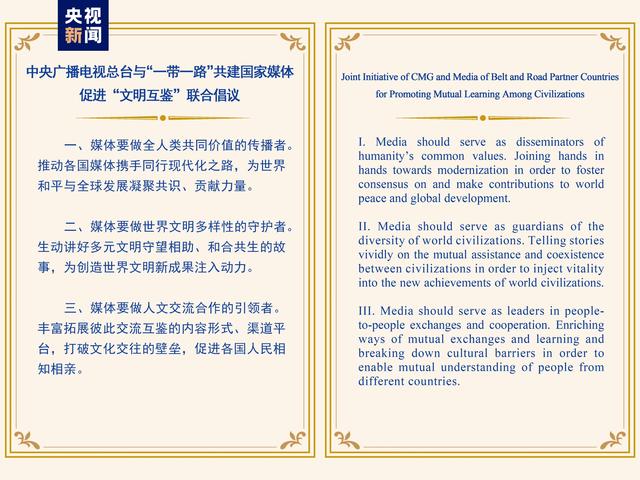 儀式上,發(fā)布了《中央廣播電視總臺與“一帶一路”共建國家媒體促進(jìn)“文明互鑒”聯(lián)合倡議》,呼吁媒體要做全人類共同價值的傳播者、世界文明多樣性的守護(hù)者、人文交流合作的引領(lǐng)者。
