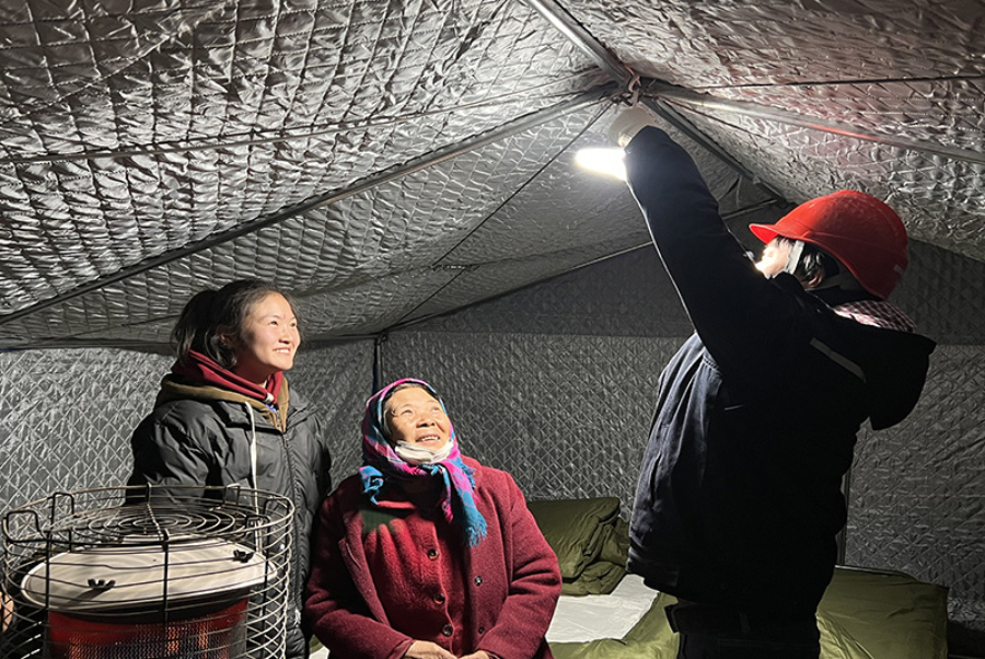 國(guó)網(wǎng)甘肅臨夏供電公司員工為積石山縣大河家鎮(zhèn)震區(qū)救治點(diǎn)帳篷接電。