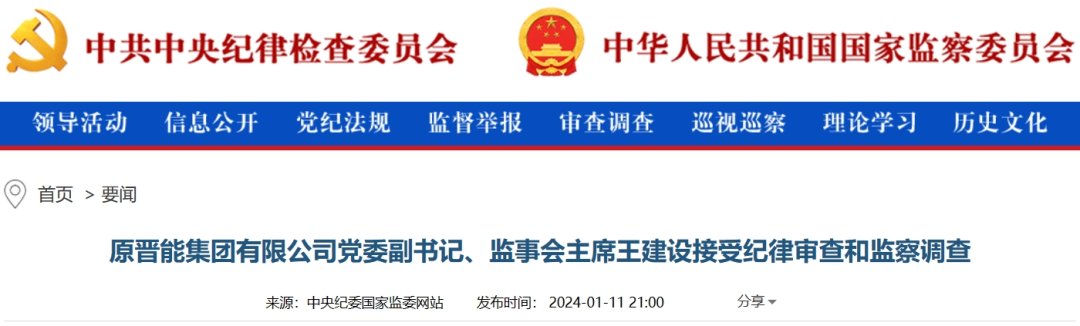 中央紀(jì)委國(guó)家監(jiān)委網(wǎng)站1月11日消息,據(jù)山西省紀(jì)委監(jiān)委消息:原晉能集團(tuán)有限公司黨委副書(shū)記、監(jiān)事會(huì)主席王建設(shè)涉嫌嚴(yán)重違紀(jì)違法,目前正接受山西省紀(jì)委監(jiān)委紀(jì)律審查和監(jiān)察調(diào)查。