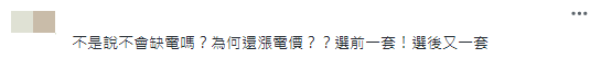 相關(guān)消息也引起島內(nèi)網(wǎng)民吐槽,有網(wǎng)民在臺(tái)媒留言區(qū)批評(píng)稱,“不是說(shuō)不會(huì)缺電嗎?為何還漲電價(jià)?選前一套!選后又一套”。