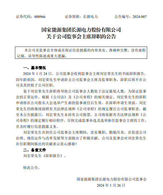 1月26日,長源電力發(fā)布公告稱,1月24日,公司監(jiān)事會收到監(jiān)事會主席劉宏榮先生的書面辭職報告。因年齡原因,劉宏榮先生申請辭去公司監(jiān)事會主席及監(jiān)事職務(wù),辭職后將不在公司及其控股子公司任職。