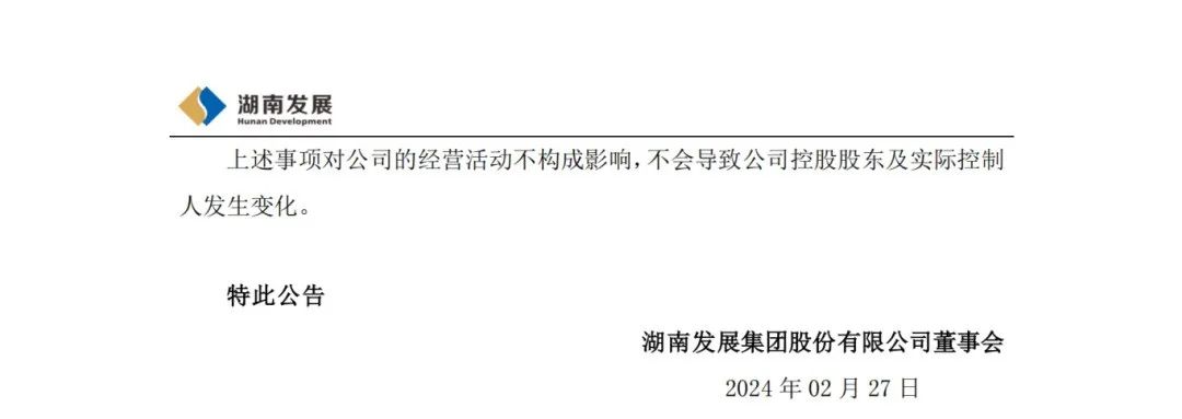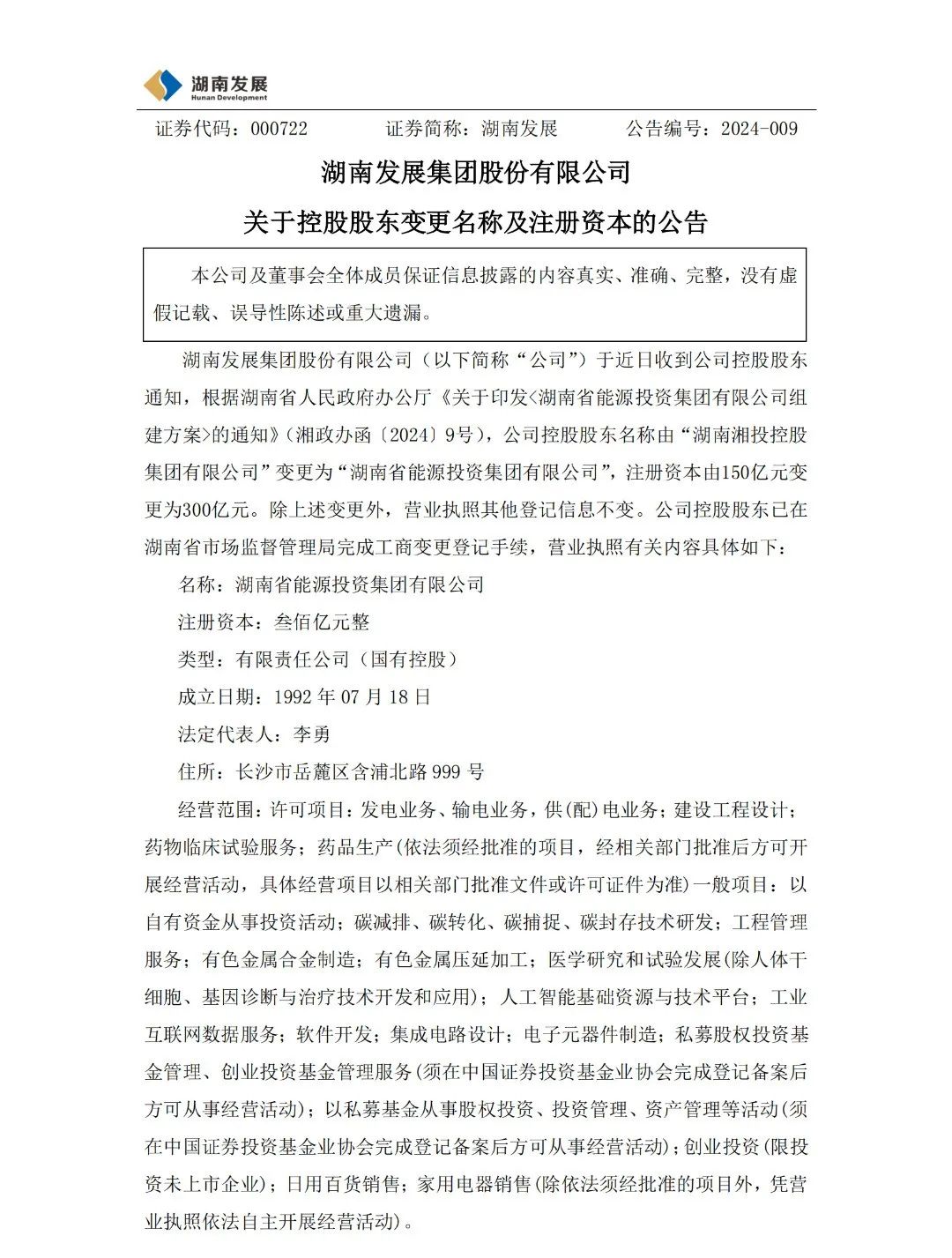 2月27日,湖南發(fā)展集團(tuán)股份有限公司發(fā)布關(guān)于控股股東變更名稱及注冊資本的公告,公告顯示:湖南發(fā)展集團(tuán)股份有限公司于近日收到公司控股股東通知,根據(jù)湖南省人民政府辦公廳《關(guān)于印發(fā)<湖南省能源投資集團(tuán)有限公司組建方案>的通知》(湘政辦函〔2024〕9號(hào)),公司控股股東名稱由“湖南湘投控股集團(tuán)有限公司”變更為“湖南省能源投資集團(tuán)有限公司”,注冊資本由150億元變更為300億元。除上述變更外,營業(yè)執(zhí)照其他登記信息不變。公司控股股東已在湖南省市場監(jiān)督管理局完成工商變更登記手續(xù)。