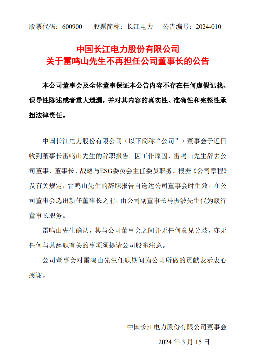 3月15日,長江電力發(fā)布公告稱,公司董事會(huì)于近日收到董事長雷鳴山先生的辭職報(bào)告。因工作原因,雷鳴山先生辭去公司董事、董事長、戰(zhàn)略與ESG委員會(huì)主任委員職務(wù)。